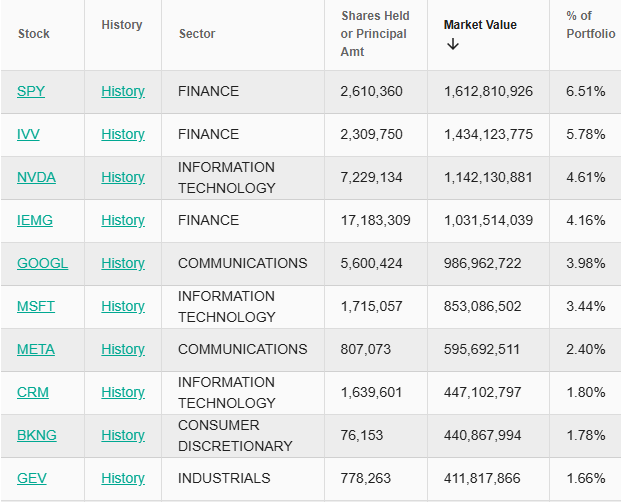 Após essas mudanças a maior posição da gestora passou a ser no índice S&P500 através de 2 ETFs: o SPDR S&P 500 ETF (SPY) e o iShares Core S&P 500 (IVV) que respondem por 12,29% da carteira. Em segundo lugar a gestora possui uma posição de 4,61% em ações da Nvidia (NVDA) – a empresa já possuía Nvidia em sua carteira, mas mais que dobrou a sua participação no portfólio com a compra de cerca de 4,3 milhões de ações durante o trimestre. Em terceiro a gestora carrega uma posição de 4,16% do portfólio no ETF iShares Core MSCI Em (IEMG) que oferece exposição geral ao mercado emergente.
