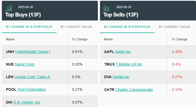 Ainda assim, como característica principal seu portfólio segue apresentando uma baixa rotatividade. Para se ter uma ideia, o tempo de permanência média de uma ação em seu portfólio é de 23 trimestres, ou seja, quase 6 anos. Na data do relatório suas 10 maiores posições respondiam por 87% do seu portfólio, de cerca de US$ 258 bilhões. O gráfico abaixo mostra as 5 principais compras e vendas do portfólio.o.