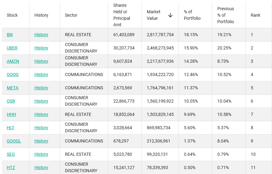 Ackman segue com uma carteira relativamente concentrada, com foco em nomes que ele considera resilientes e potencialmente subvalorizados, além de novas apostas de alto impacto.