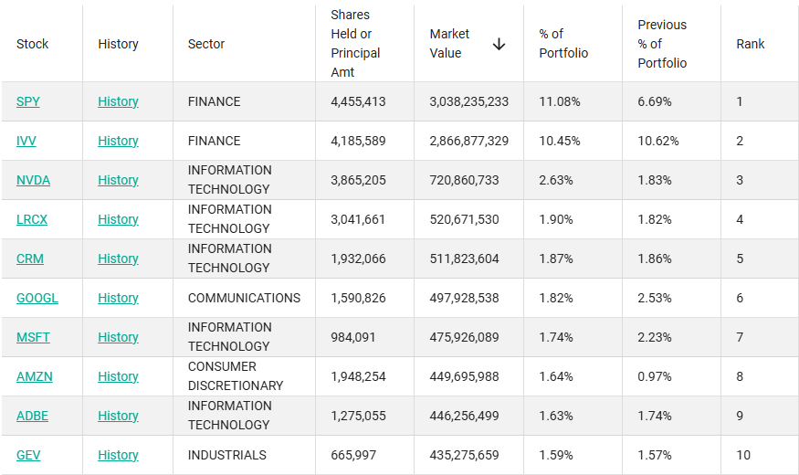 No 4T2025, a carteira totalizou aproximadamente US$ 274 bilhões, com baixa rotatividade (turnover de 2,38%) e período médio de manutenção de 24,76 trimestres (mais de 6 anos). Os 10 principais ativos representam 88,26% da carteira, mostrando alta concentração.