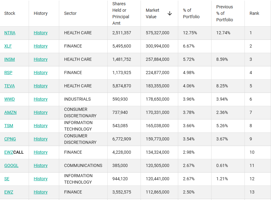 Suas 5 maiores posições atualmente são: NTRA (Natera Inc) com 12,8% do portfólio, XLF (Financial Select Sector SPDR Fund) com 6,7%, INSM (Insmed Inc) com 5,74%, RSP (Invesco S&P 500 Equal Weight ETF) com 5%, TEVA (Teva Pharmaceutical Industries) com 4,08%.