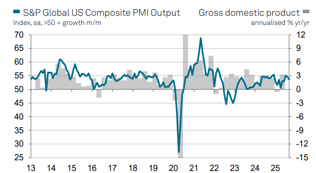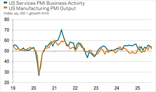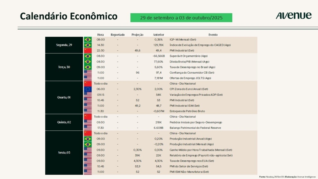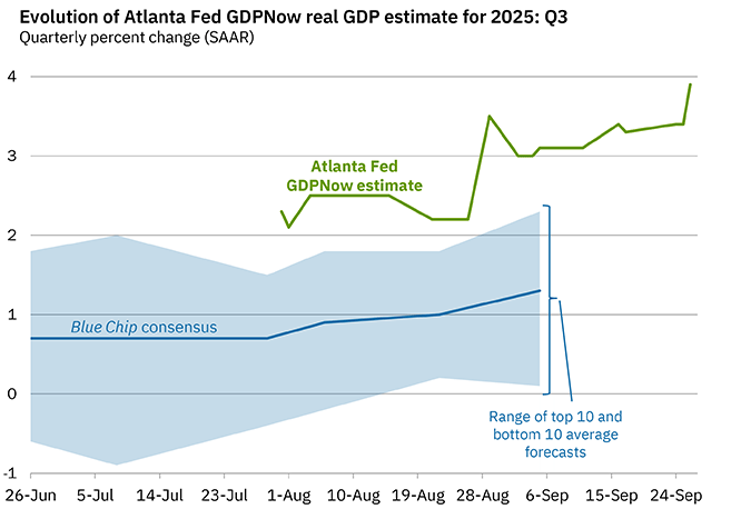 Além disso, os indicadores divulgados nesta semana, incluindo o PMI, corroboram a tendência apresentada pela ferramenta do Fed de Atlanta, o GDPNow, de um nível de atividade forte para o terceiro trimestre de 2025. Em 26 de setembro, a estimativa do modelo para o crescimento real do PIB (taxa anual ajustada sazonalmente) chegou a 3,9%, acima dos 3,3% registrados em 17 de setembro.