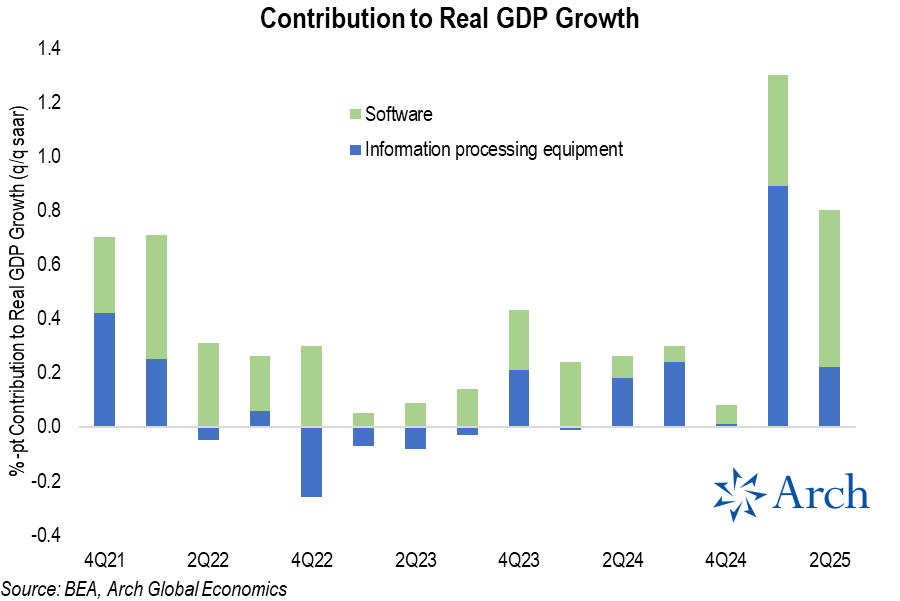 Parte da explicação para esse nível de atividade também reside da força e no volume dos investimentos realizados em tecnologia. Para Parker Ross, Global Chief Economist na Arch Capital Group, está claro que a resiliência observada recentemente na economia é resultado do aumento dos investimentos empresariais em software e tecnologia. Esses aportes contribuíram, em média, com mais de 1% para o crescimento real do PIB no primeiro e segundo trimestres – conforme ilustra o gráfico abaixo.