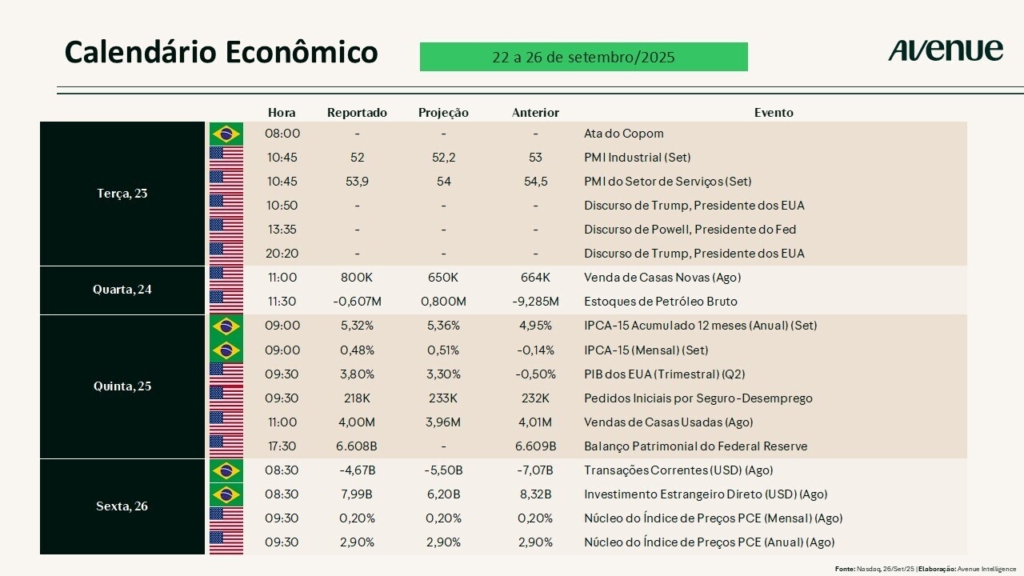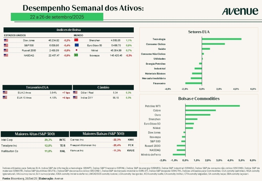 Na bolsa, a semana foi marcada por volatilidade, com os principais índices recuando após atingirem recordes recentemente, interrompendo assim uma sequência de três semanas de ganhos. O mercado reagiu a preocupações e revisou o cenário de cortes de juros, refletindo os dados da atividade econômica mais fortes do que os esperados e também as preocupações em relação às novas tarifas sobre farmacêuticos e caminhões grandes. Por outro lado, o dado de inflação PCE em linha com as expectativas ajudou a contrabalançar essa percepção.