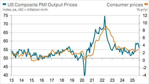 Em relação às tarifas, a divulgação dos dados do PMI trouxe novamente o tema à tona: elas voltaram a ser amplamente citadas como o principal motivo para o aumento dos custos. Por outro lado, a demanda mais fraca e a forte concorrência restringiram o espaço para reajustes nos preços de venda, que subiram no ritmo mais lento desde abril. No relatório do PCE, chamou a atenção o fato de as tarifas terem apresentado um efeito de repasse bastante limitado para os preços ao consumidor, sugerindo que as empresas têm absorvido parte desses custos, seja acumulando estoques pré-tarifários, seja adotando outras estratégias para amenizar o impacto.