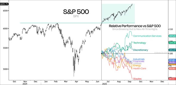 Saindo um pouco do resumo semanal, o gráfico abaixo é bastante interessante por mostrar um breakdown setorial de performance desde que o S&P 500 atingiu sua máxima histórica, em junho. Ele evidencia quais setores conseguiram registrar desempenhos positivos desde então, deixando clara a discrepância entre segmentos de tecnologia e setores como saúde e consumo defensivo.