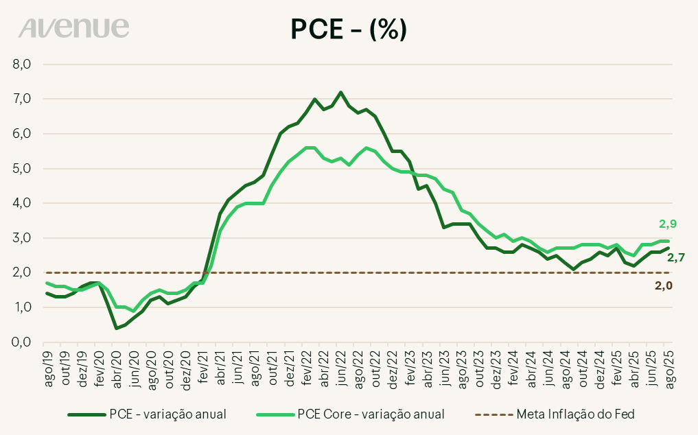 O relatório divulgado na sexta-feira (26) pelo Departamento de Comércio mostrou que o índice de preços de despesas de consumo pessoal (PCE), a medida de inflação preferida do Federal Reserve, subiu 0,3% em agosto de 2025, resultando em uma taxa de inflação anual de 2,7%, em linha com o previsto. O PCE núcleo, que exclui alimentos e energia, aumentou 0,2% no mês e 2,9% em relação ao ano anterior, também dentro do esperado. Já os gastos do consumidor aumentaram 0,6%, superando a expectativa de alta de 0,5%.