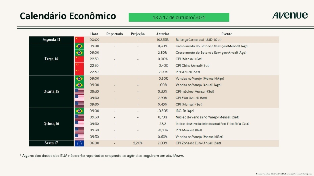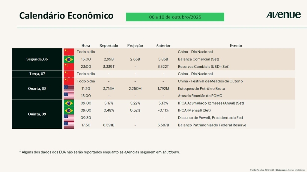Porém, um dos pontos de destaque negativo para tal evento, seria a pausa na divulgação de dados econômicos. E isso já ocorreu. A ausência de relatórios oficiais criou um “vácuo de dados” que pode dificultar decisões do Federal Reserve e dos investidores. O relatório de empregos (Payroll) de setembro, originalmente programado para 3 de outubro, foi adiado indefinidamente. Há preocupações de que isso também afete os dados de inflação (CPI e PPI) e vendas no varejo programados para esta semana.
