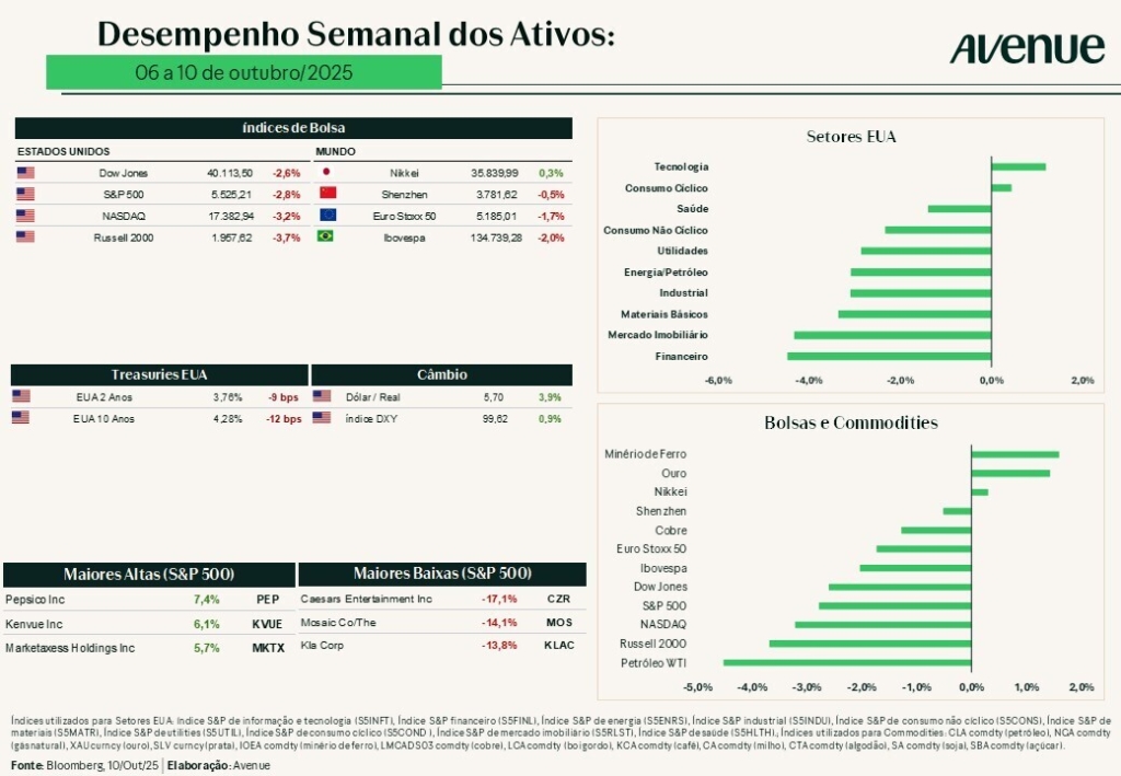 A sexta-feira, 10 de outubro, porém, ficará marcada como um dos pregões mais voláteis dos mercados americanos em 2025. O que começou como uma manhã promissora, com o Nasdaq atingindo nova máxima histórica intradiária, rapidamente se transformou em uma queda forte após um único post do presidente Trump em sua rede social. O S&P 500 e o Nasdaq registraram suas maiores quedas percentuais em um único dia desde 10 de abril. Para o Dow Jones, foi a pior sessão desde junho.