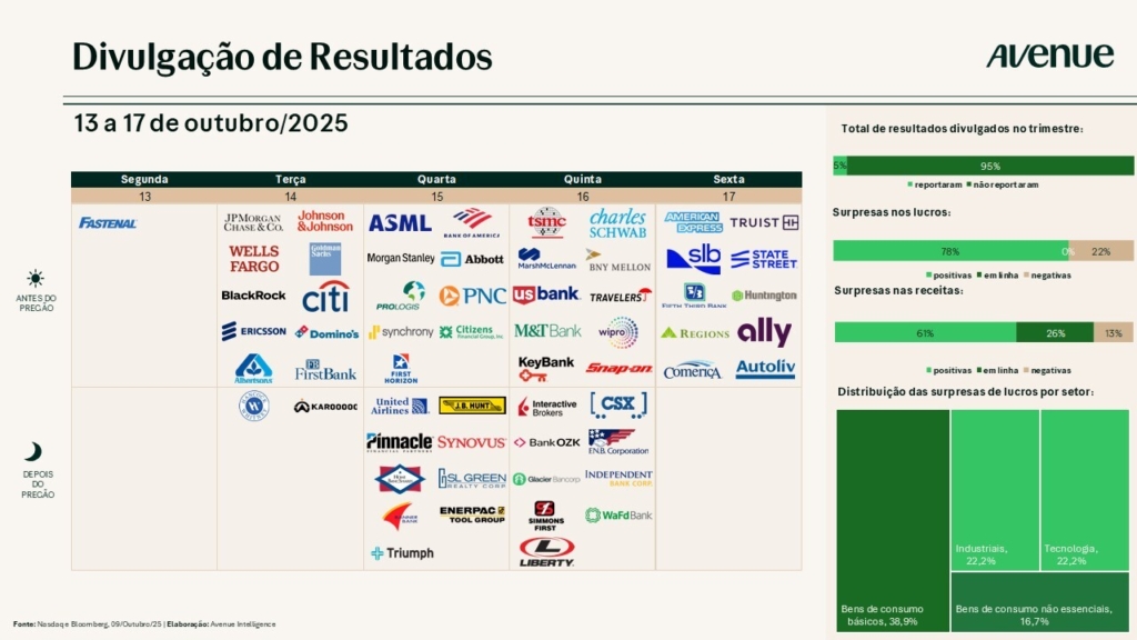 A temporada de resultados do terceiro trimestre de 2025 inicia oficialmente nesta semana, com os grandes bancos americanos liderando os anúncios. JPMorgan Chase, Goldman Sachs, Citigroup e Wells Fargo estão programados para divulgar seus números nos próximos dias, estabelecendo o tom para o que pode ser o nono trimestre consecutivo de crescimento de lucros para o S&P 500 (de acordo com projeções da Factset).