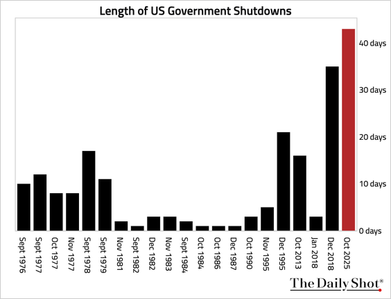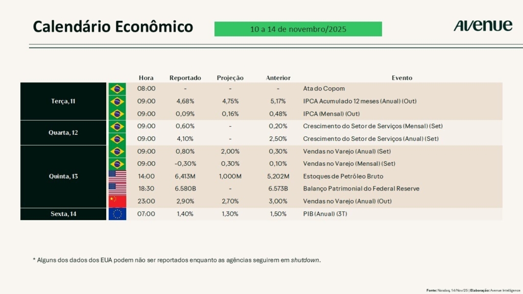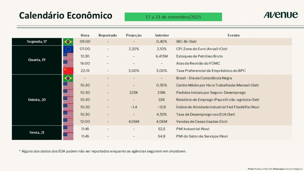 A recente paralisação do governo alterou o cronograma de divulgações, priorizando dados atrasados – como o relatório de empregos de outubro – e adiando outros (por exemplo, dados de inflação, CPI/PPI de novembro, vendas no varejo, entre outros) em pelo menos uma semana.