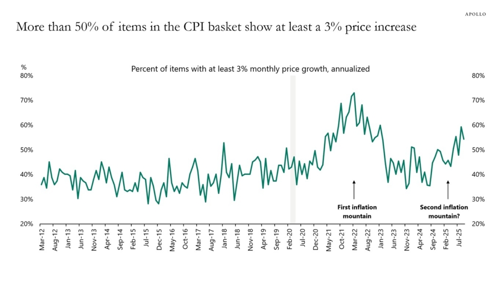 Corroborando com essa preocupação com a inflação e percepção do mercado acerca dos juros, o economista-chefe da Apollo Asset Management observou que 55% dos itens da cesta do CPI estão crescendo a mais de 3% em uma base anual, conforme mostra o gráfico abaixo. Ou seja, um número bem acima da meta do Fed e que tende a pressionar a decisão dos dirigentes.