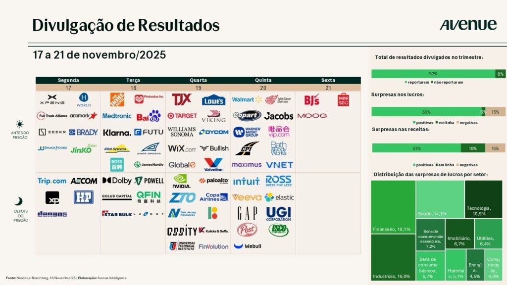 A temporada de balanços chega próximo ao final, com 91% das empresas do S&P 500 (455 de 500 empresas) divulgado seus números até agora. Como temos comentado já aqui nessa coluna, a temporada de balanços do 3º trimestre de 2025 foi forte no geral, com crescimento de lucros do S&P 500 estimado em 13% ano a ano, e mais de 82% das empresas reportando números acima do esperado.