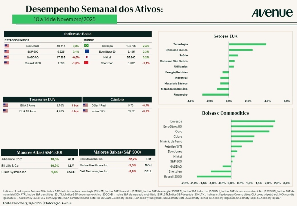 Esta semana foi marcada pela volatilidade no mercado acionário americano, com recuos nos principais índices. O mercado começou com otimismo pela possível solução da paralisação do governo, mas seguiu a máxima do “sobe no boato e cai no fato” com quedas nos últimos dias da semana. Pesaram contra: (i) preocupações com valuations elevados; (ii) expectativas frustradas de cortes de juros pelo Fed; (iii) resultados corporativos mistos nessa semana.