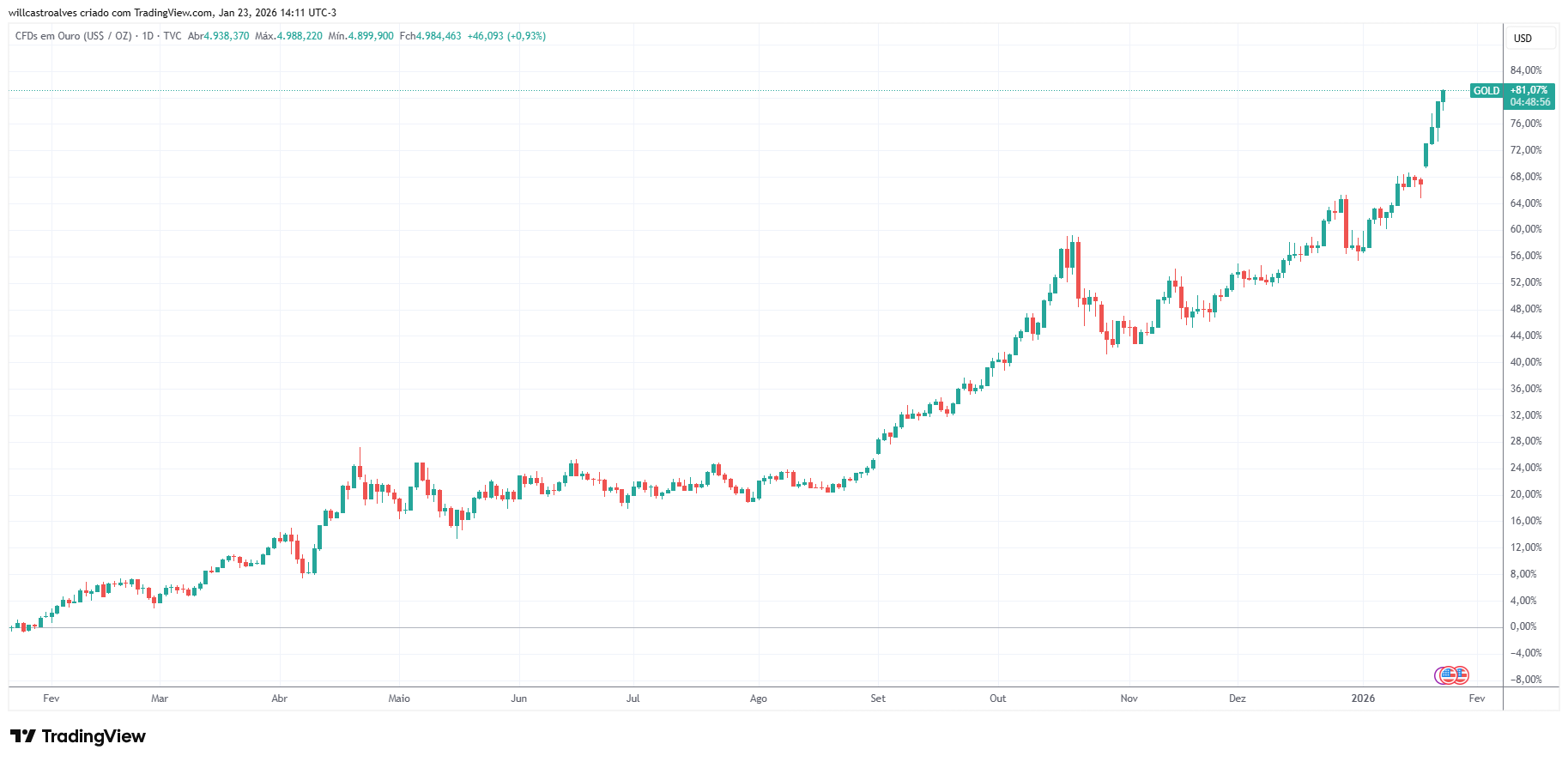 Fonte: Tradingview.com, 23/jan/2026 – Ouro