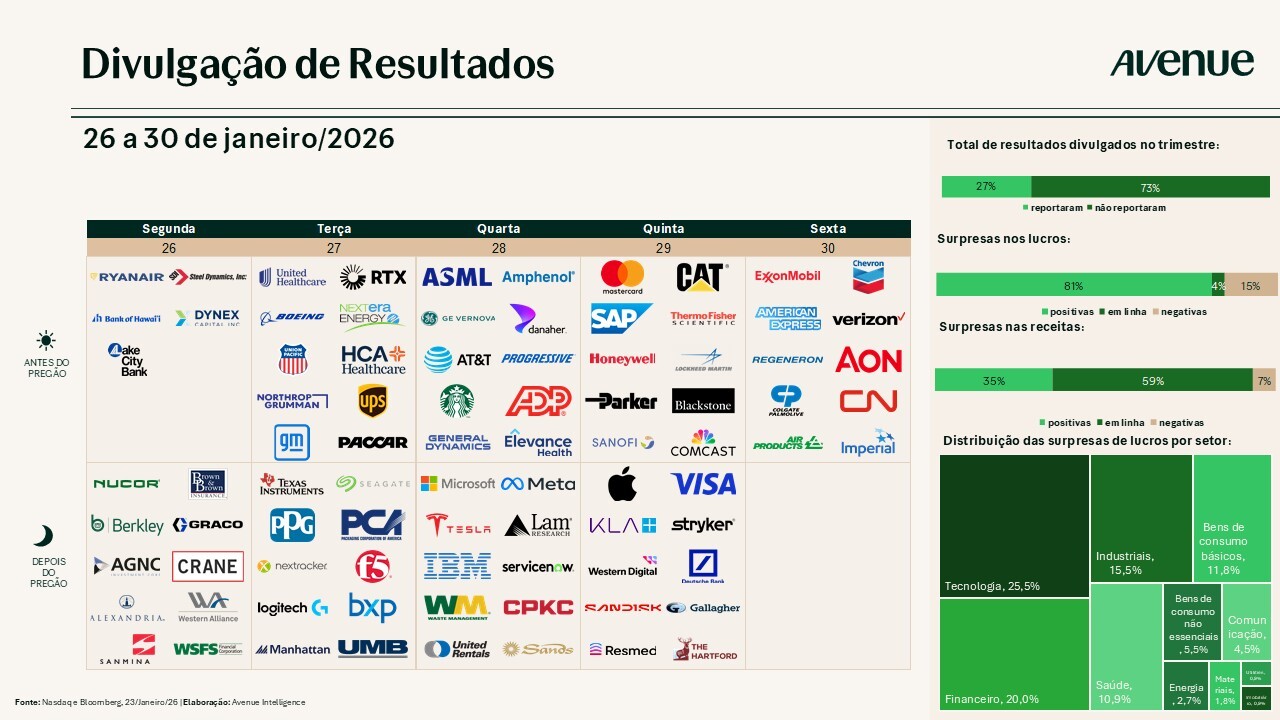 Para além dos dados econômicos, essa é a semana mais importante em termos de resultados corporativos do 4T25. Afinal, teremos os principais nomes de tecnologia divulgando seus números essa semana – Microsoft, Meta, Tesla, Apple, Amazon – além de outras tradicionais empresas americanas, como: Boeing, United Health, Visa, Mastercard, Caterpillar, Exxon, Chevron, entre outras.