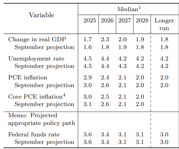 Projeções. Em relação às projeções do Fed, o gráfico de pontos – que mostra as expectativas dos membros do comitê sobre as taxas de juros – indicou apenas um corte em 2026 e outro em 2027, com a taxa chegando a 3%. Quanto à economia, o comitê elevou sua projeção para o Produto Interno Bruto (PIB) em 2026 para 2,3%, e para a inflação espera que ela permaneça acima da meta de 2% até 2028. Abaixo está a tabela que compila as previsões.
