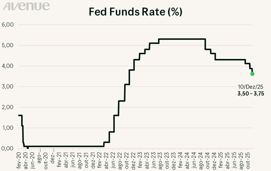 A decisão. Com 9 votos a favor e 3 contra, foi aprovado mais um corte na taxa de juros americana. Em linha com o esperado pelo mercado, o Comitê de Política Monetária Americana (FOMC) anunciou um corte de 0,25 pontos percentuais na sua taxa referência (Fed Funds Rate) para um intervalo entre 3,50% e 3,75%.