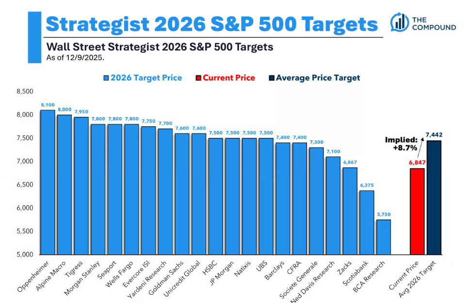 Final de ano é sempre um momento de projetar o ano que se inicia. Nesse sentido, cada dia temos visto atualizações e novas projeções para o cenário de ações em 2026. Pois bem, abaixo um gráfico resumo das expectativas médias do mercado para o S&P 500 em 2026 – 7.442 pontos – o que, na data de confecção do gráfico, representava um retorno implícito de 8,7%.