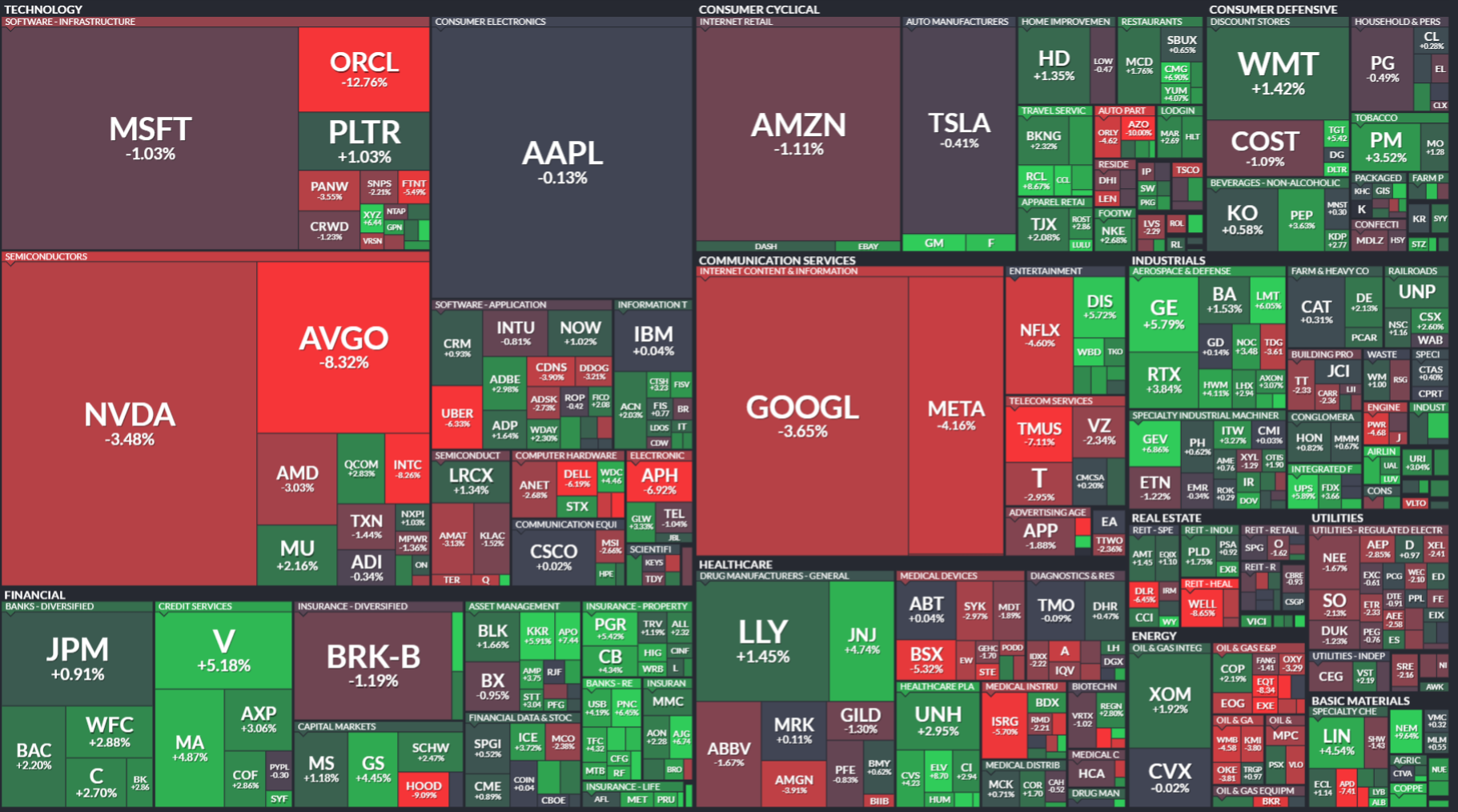 Na bolsa, o mercado foi marcado por volatilidade moderada, sem uma tendência definida, com um movimento claro de rotation acontecendo. O S&P 500 ficou perto do recorde histórico, o Dow subiu levemente e o Nasdaq caiu, especialmente com os resultados de Oracle e Broadcom. Podemos dizer que o apetite por ações americanas continuou forte, mas com um movimento claro de redução de exposição a ações de tecnologia para setores mais defensivos e cíclicos — o que fez com que o S&P 500 e Nasdaq apresentassem um desempenho mais modesto comparativamente ao Dow Jones. Abaixo está o mapa de performance semanal do S&P 500; é possível ver uma performance mais fraca de ativos de tecnologia na semana.