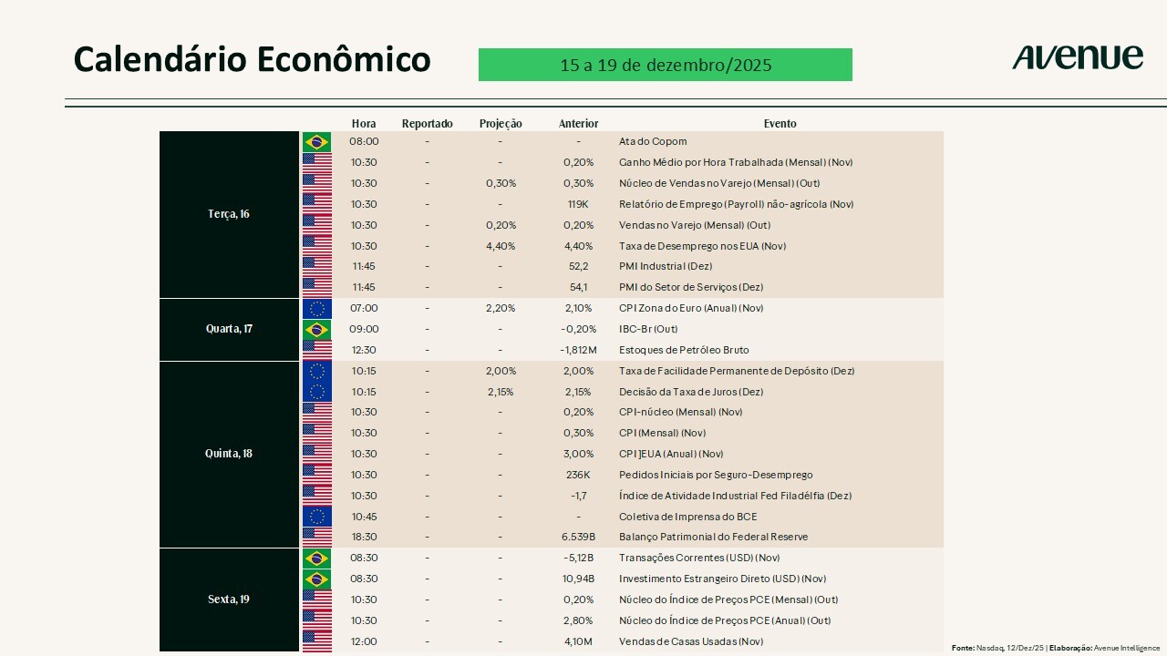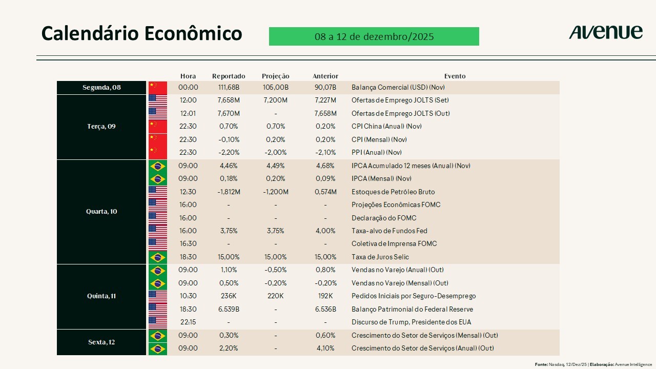 Fonte: Bloomberg. Elaboração: Avenue Intelligence – 10/dez/2025.