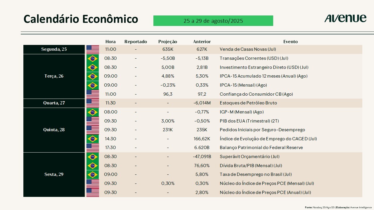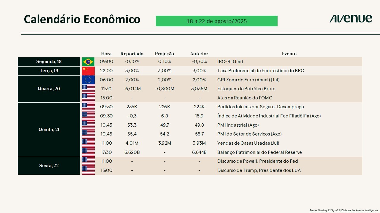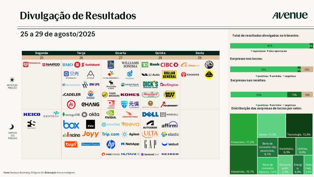 Para esta semana, teremos a divulgação do tão aguardado resultado da Nvidia (NVDA), atualmente considerada a maior empresa dos EUA, com valor de mercado superior a US$ 4 trilhões, e um expoente no crescente mercado de inteligência artificial.