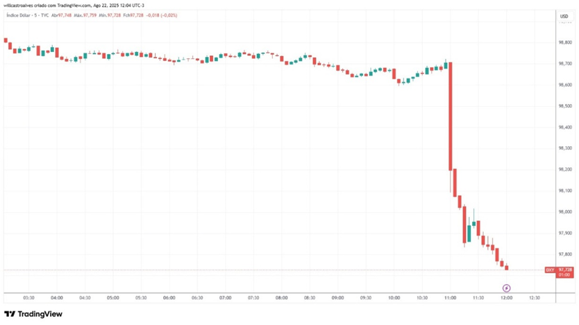 Fontes: DXY e USD/BRL, em 22/ago/2025