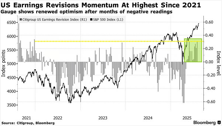 Até o momento, 475 das 500 empresas do S&P 500 divulgaram os seus números (95%), sendo que 69% delas superaram as estimativas de receita e 81% superaram as previsões de lucro por ação. Esses números, melhores do que os esperados pelo mercado, impulsionaram várias revisões para cima acerca dos lucros futuros das empresas do S&P 500.