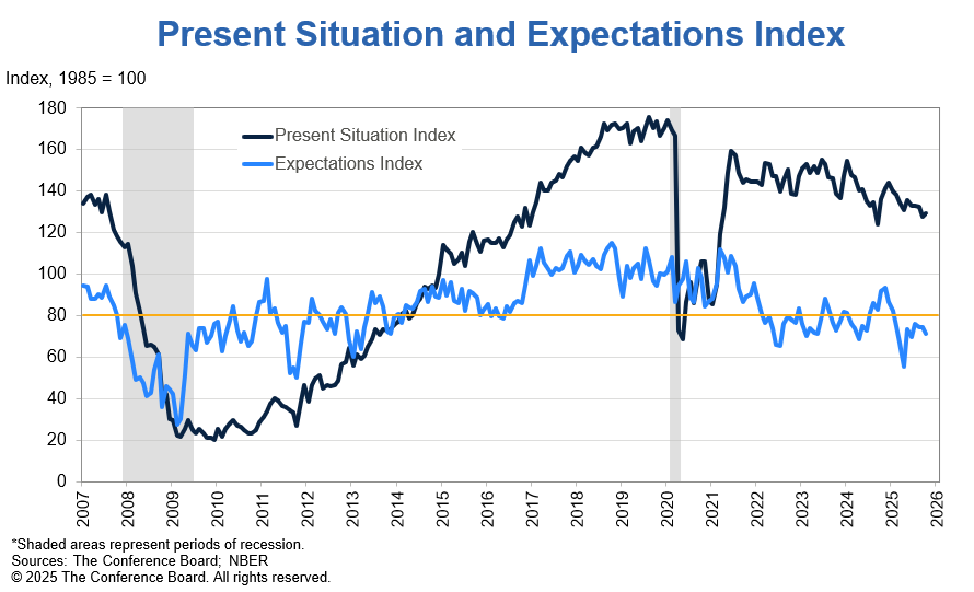 “A confiança do consumidor oscilou lateralmente em outubro, recuando apenas ligeiramente em relação ao nível revisado para cima de setembro”.