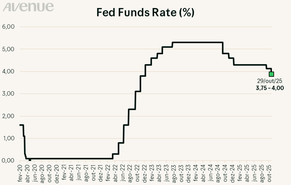 Mas o grande evento econômico da semana era a decisão de juros americana. Tal qual amplamente esperado, o comitê de política monetária americana (FOMC) anunciou um corte de 0,25 p.p. em sua taxa de referência da economia (Fed Funds Rate) para um intervalo entre 3,75% e 4,00%.
