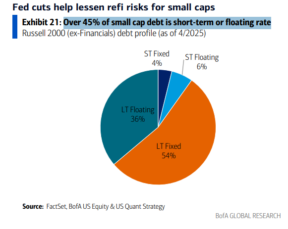 Qual a justificativa? Embora o otimismo do mercado tenha contribuído, uma parte relevante da explicação está no perfil de dívida dessas empresas. O gráfico abaixo traz o breakdown do endividamento das companhias do Russell 2000. Por um lado, 54% da dívida dessas empresas está concentrada no longo prazo e atrelada a taxas de juros fixa, o que as protege de variações nas taxas. Por outro lado, 42% desse endividamento está vinculado a taxas flutuantes, seja de curto ou de longo prazo (LT Floating e ST Floating, conforme indicado no gráfico acima). Portanto, a redução dos juros tende a diminuir o encargo da dívida dessas empresas, incrementando seu fluxo de caixa no curto prazo.