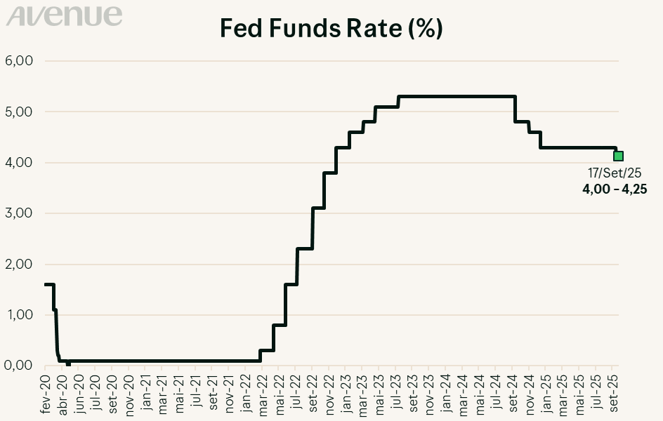Após manter as taxas de juros inalteradas por cinco reuniões seguidas ao longo de nove meses, o Comitê de Política Monetária Americana (FOMC) anunciou um corte de 0,25 pp em sua taxa referência da economia (Fed Funds Rate). Com isso, a faixa passou para um intervalo entre 4,00% e 4,25%, exatamente como o mercado já previa.