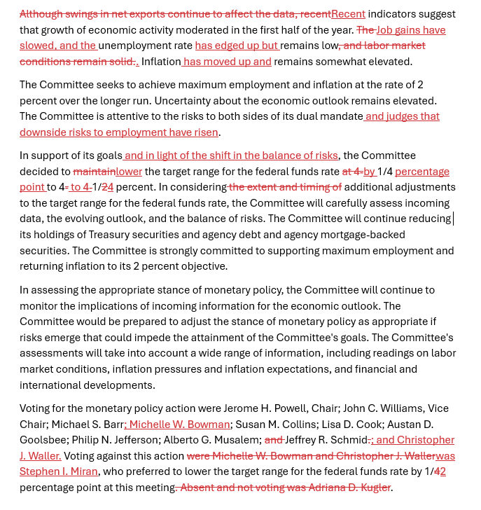A novidade ficou por conta do tom mais dovish no comunicado. O Fed incluiu três frases que reforçam essa preocupação maior com a economia: “os riscos negativos para o emprego aumentaram”, “os ganhos de empregos desaceleraram” e “a taxa de desemprego aumentou ligeiramente”. Isso é importante, pois sinaliza uma postura de continuidade nos cortes daqui para a frente – confira abaixo o comunicado com as alterações em comparação com o da última reunião, em julho.