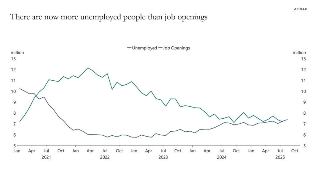 Nesse sentido, observando o mercado laboral americano, atualmente há 7,4 milhões de desempregados para 7,2 milhões de vagas de emprego – vide gráfico abaixo. Esta é a primeira vez, desde 2021, que o número de desempregados supera o de vagas de emprego.
