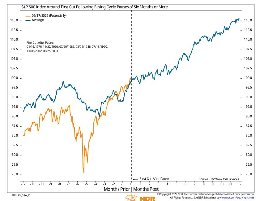 Ao traduzir esse conceito para um gráfico, chegamos à imagem abaixo. Nela, vemos que o S&P 500 apresentou correções aproximadamente de quatro a oito meses antes do fim das pausas de flexibilização (cortes de juros) – interessante notar como esse padrão histórico se assemelha ao que temos visto neste ano. Não obstante, após o recomeço dos cortes, o índice registrou, em média, um desempenho positivo ao longo dos 12 meses subsequentes, conforme ilustrado. Vale ressaltar que não há garantias de que esse comportamento se repetirá desta vez.