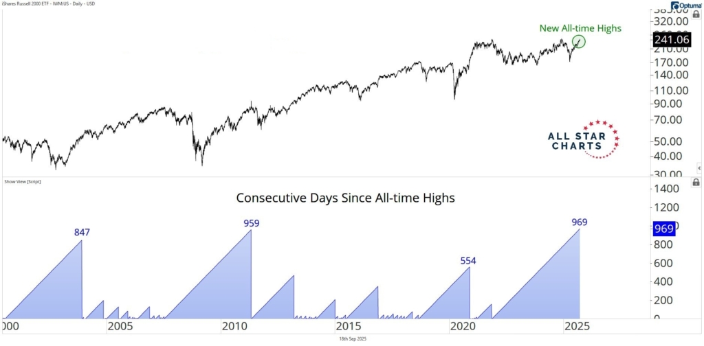 Mas, além da boa performance dos principais índices, chamou a atenção o desempenho das small caps, que voltaram a atingir máximas históricas. O gráfico abaixo apresenta a evolução do índice de Small Caps Russell 2000 nos últimos 21 anos. Os pontos de máximas foram registrados em 2021, no final de 2024 e, novamente, agora em 2025. Após um recorde de 969 dias, o Russell voltou a alcançar um novo topo histórico.
