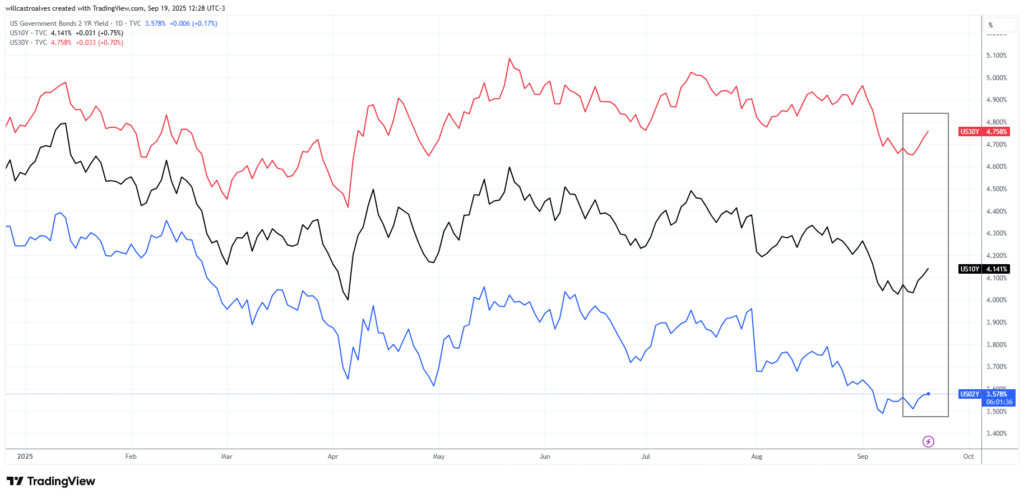 Com relação aos juros, vimos uma inversão do clássico “sobe no boato, cai no fato” — desta vez, presenciamos um verdadeiro “cai no boato, sobe no fato”. Após semanas de queda nos yields dos títulos americanos, num movimento iniciado desde o evento de Jackson Hole e reforçado pelo Payroll mais fraco, houve um ajuste: os yields voltaram a subir, mesmo após a decisão pelos cortes de juros e a perspectiva de novas reduções no futuro.