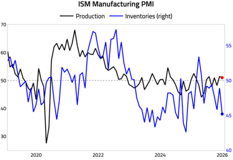 O PMI da indústria se mostrou aquém do esperado pelo mercado. O setor manufatureiro americano encerrou 2025 em contração pelo décimo mês consecutivo, com o índice PMI do ISM caindo para 47,9 em dezembro — o nível mais baixo em 14 meses (desde outubro de 2024) e abaixo da expectativa de 48,4 dos economistas. Apesar do dado mais fraco, a abertura do índice mostrou que parte relevante dessa queda decorreu da redução de estoques nesse último mês (vide gráfico abaixo), algo que tende a ser passageiro e pontual.