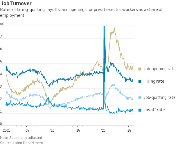 Os dados do mercado de trabalho americano divulgados nesta semana reforçaram a visão de um ambiente de desaceleração e baixa atividade, com empresas demorando tanto para contratar quanto para demitir – a tônica do “low hire, low fire”. O gráfico abaixo, extraído do JOLTS, ilustra esse ritmo mais lento: contratações desaceleram, abertura de novas vagas diminui, demissões voluntárias caem e os layoffs não mostram aumento relevante. Parte relevante dessa mudança pode ser explicada pela dinâmica de imigração nos EUA, mas isso foge ao escopo deste artigo semanal.