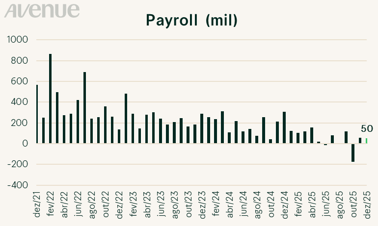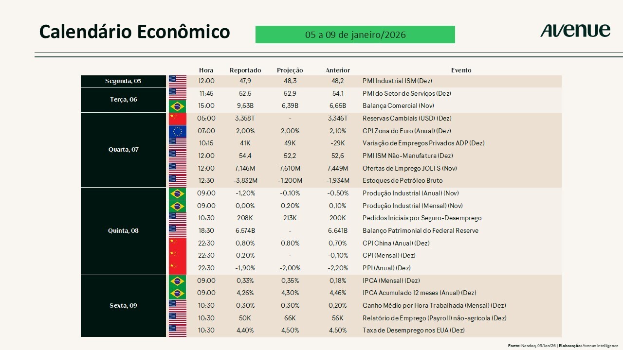 Na sexta-feira, tivemos o Payroll. O Departamento de Estatísticas do Trabalho dos EUA (BLS) divulgou o relatório de empregos não agrícolas de dezembro de 2025, mostrando criação de 50 mil postos de trabalho, abaixo das estimativas de consenso e do número revisado de novembro (56 mil). Ao mesmo tempo, a taxa de desemprego caiu para 4,4%, frente à previsão de 4,5%. O salário médio por hora aumentou 0,3% no mês, em linha com a previsão, e o aumento anual de 3,8% ficou levemente acima do esperado.