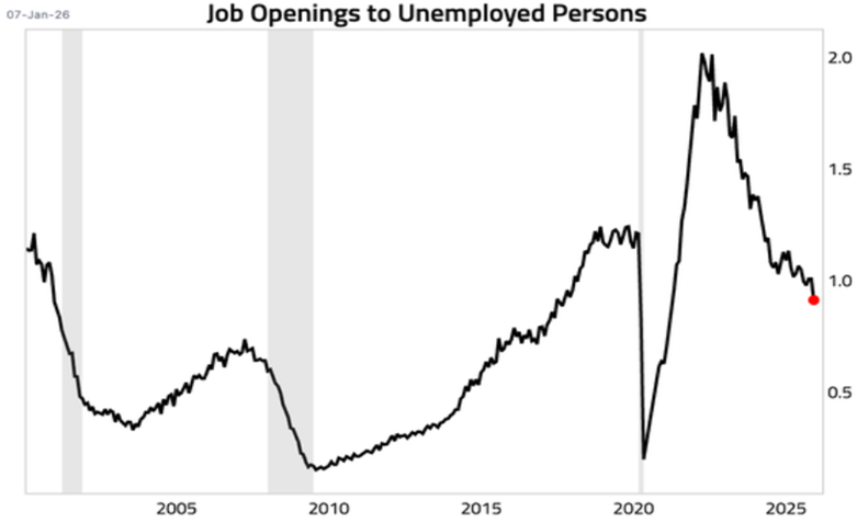 Indo para o mercado de trabalho, o último relatório JOLTS, divulgado no dia 7 de janeiro e que traz os dados de novembro de 2025, mostrou um resfriamento na demanda por mão de obra nos EUA. As vagas de emprego caíram 303 mil, para 7,146 milhões, nível mais baixo desde setembro de 2024 e abaixo do esperado pelo mercado, em torno de 7,6 milhões. A queda foi impulsionada por reduções em setores como hospedagem e serviços de alimentação (-148 mil) e transporte, armazenagem e utilidades (-108 mil), enquanto o setor de construção registrou ganho (+90 mil).