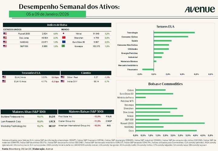 O mercado de ações nos EUA apresentou desempenho misto, com S&P 500 e Dow Jones renovando máximas em alguns dias, enquanto se observou rotação de investimentos das grandes empresas de tecnologia para ações de pequenas empresas, setores defensivos e de energia. O Nasdaq cedeu levemente em alguns momentos devido à fraqueza em tecnologia, enquanto o Russell 2000 (small caps) subiu mais de 1% e atingiu novo recorde. No geral, investidores deixaram em segundo plano parte das tensões geopolíticas e concentraram-se em dados econômicos mistos e no início da temporada de balanços.