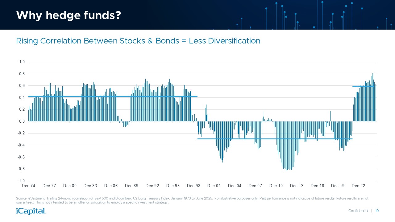Hedge funds e ativos privados oferecem características diferenciadas que podem proporcionar maior diversificação e menor volatilidade em cenários de estresse sistêmico, atributos que os modelos tradicionais baseados apenas em ações e títulos de renda fixa muitas vezes não conseguem replicar.