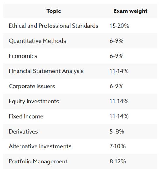 A matéria do Level 1 é muito extensa, englobando os seguintes 10 tópicos, com seus respectivos pesos: