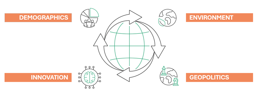 As mudanças demográficas, a desigualdade, a pressão sobre o capital humano, os direitos humanos e a saúde pública estão impulsionando a demanda por sistemas mais inclusivos e resilientes. Embora sejam questões complexas, elas podem gerar soluções inovadoras e novas oportunidades de investimento.