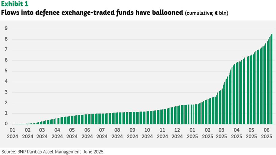 Com mais de € 1,6 trilhão em investimentos planejados pela Europa nos próximos 10 anos, está se tornando cada vez mais evidente para muitos investidores que surge uma oportunidade de longo prazo. Os fluxos de ETFs refletem esta tendência. Em 2024 registaram‑se pouco mais de € 1,9 mil milhões em entradas nos ETFs de defesa. O ritmo acelerou em 2025, com já mais de € 8 mil milhões em investimentos líquidos até agora neste ano (veja no gráfico 1).