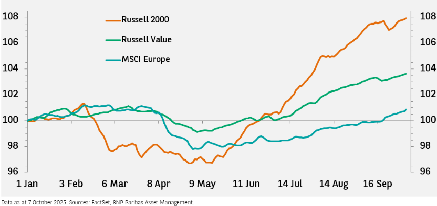 Tanto as partes de grande capitalização e não‑tecnológicas do mercado dos EUA (representadas pelo índice Russell 1000) quanto as ações de grande capitalização europeias estão em situação mais desfavorável diante das tarifas de importação dos EUA do que as ações de pequena capitalização.