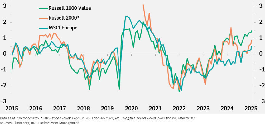 Em relação à história dos últimos 10 anos, o P/E de 25× do Russell 2000 corresponde a um z-score de 0,8, enquanto o z-score do índice Russell Value é 1,4 e o da Europa, 0,2.