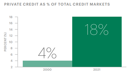 Ou seja, esses fundos permitem que investidores financiem diretamente empresas sem o envolvimento de bancos tradicionais, oferecendo menor volatilidade que os mercados públicos. Mas assim como os fundos de Private Equity, a liquidez e janelas para resgate costumam ser menores e mais espaçadas, permitindo com que o gestor atue de uma forma mais deliberada, sem muitas pressões de resgates imediatos. O crescimento do mercado de crédito privado é ainda mais marcante que o de Private Equity, saindo de 4% para 18% entre 2000 e 2021.