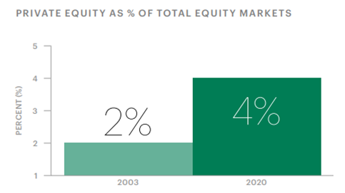 Esta classe de ativos é conhecida por acessar mercados mais difíceis para o investidor pessoa física sozinho. Por conta dessa exclusividade, os investimentos costumam ter menor liquidez, prazos mais longos para resgate e materialização dos possíveis retornos. De acordo com a Apollo, o mercado de Private Equity dobrou entre 2003 e 2020, conforme imagem abaixo.